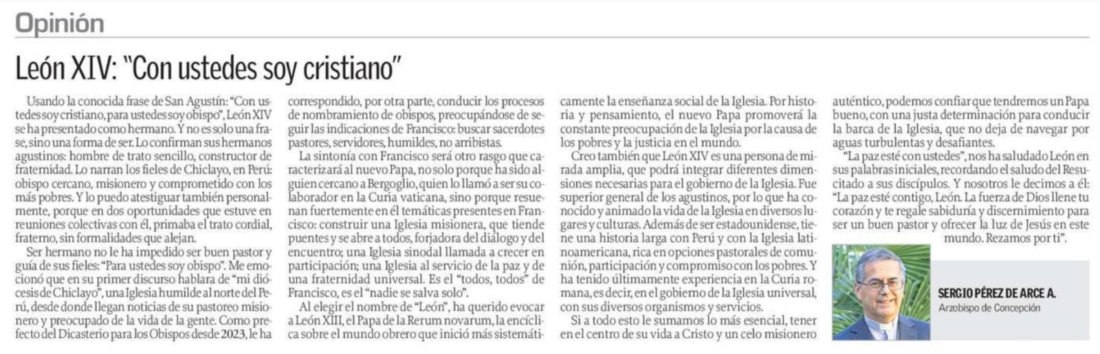 Usando la conocida frase de San Agustín: “Con ustedes soy cristiano, para ustedes soy obispo”, León XIV se ha presentado como hermano. Y no es solo una frase, sino una forma de ser. Lo confirman sus hermanos agustinos: hombre de trato sencillo, constructor de fraternidad. Lo narran los fieles de Chiclayo, en Perú: obispo cercano, misionero y comprometido con los más pobres. Y lo puedo atestiguar también personalmente, porque en dos oportunidades que estuve en reuniones colectivas con él, primaba el trato cordial, fraterno, sin formalidades que alejan.