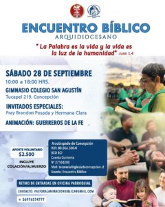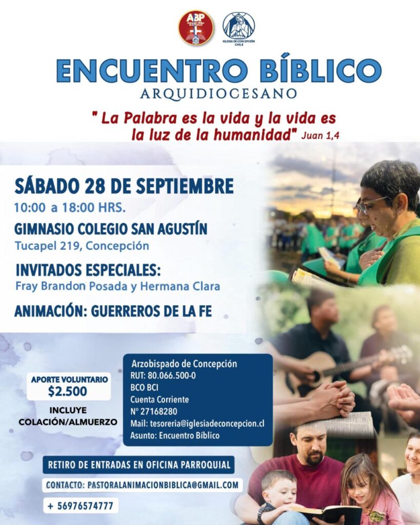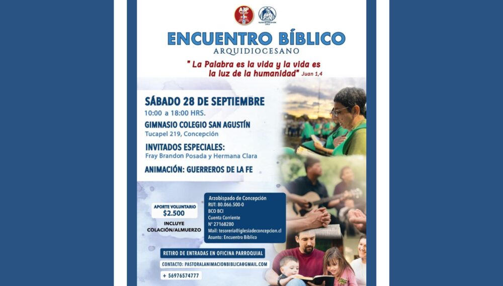 Bajo el lema “La Palabra es la vida y la vida es la luz de la humanidad” (Jn 1,4) se realizará el Encuentro Bíblico Arquidiocesano este sábado 28 de septiembre en las dependencias del Colegio San Agustín de Concepción, ubicado en Tucapel 219.