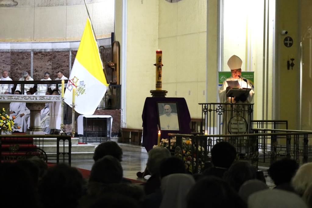 La comunidad de la Arquidiócesis de Concepción se reunió en la Catedral para orar por el eterno descanso del Papa Francisco, quien partió a la Casa del Padre a los 88 años. La Eucaristía fue presidida por el Arzobispo, Mons. Sergio Pérez de Arce SS.CC., y concelebrada por el Obispo Auxiliar Mons. Bernardo Álvarez y el Pbro. Francisco Osorio, Deán de la Catedral.