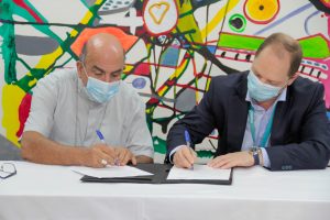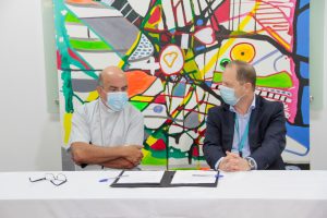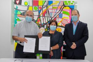 El Arzobispo de Concepción, Monseñor Fernando Chomali, en conjunto con Harry Cea, Gerente de Clientes, y Enrique Coulembier, CEO de la compañía, se reunieron en el salón principal de la cafetería para conversar sobre la gran utilidad del convenio y detalles técnicos.