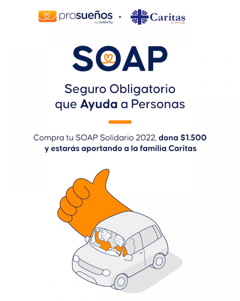 Caritas Chile invita a sumarse y apoyar su trabajo por las personas más vulnerables, contratando el nuevo Seguro Obligatorio Automotriz Personal, SOAP solidario, por el cual se puede donar $1.500 que serán recibidos directamente por la organización.