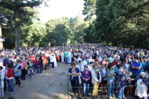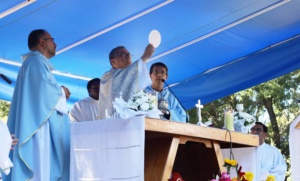 Los miles de fieles que se encontraban en el campo de oración recibieron con aplausos la llegada de la procesión y luego participaron en la Santa Misa.