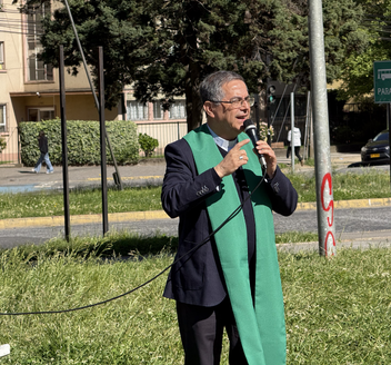 Luego, representantes del Jardín Infantil Fabiola entregaron los alimentos que se están reuniendo en las comunidades educativas para ser entregados en el Hogar de Ancianos de las Hermanitas de los Pobres. Mientras que estudiantes del Instituto de Humanidades Alfredo Silva Santiago ofrecieron los dones de pan y vino, que luego se convertirán en el Cuerpo y la Sangre del Señor.