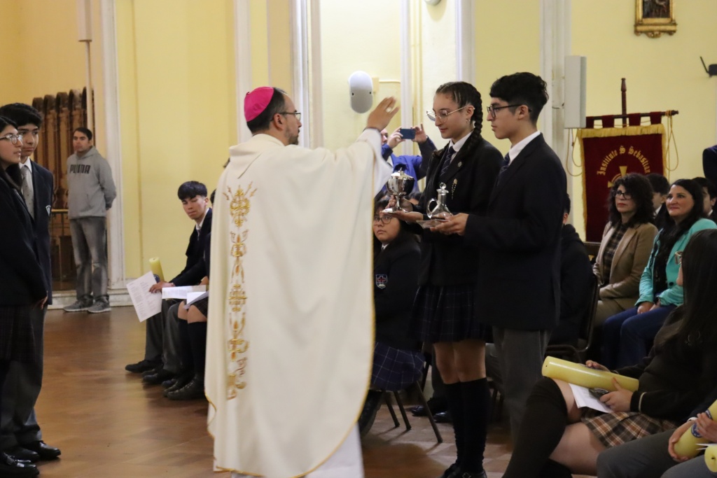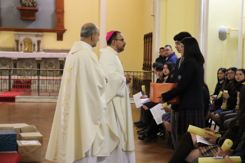 En el momento de la presentación de las ofrendas, el Colegio Inmaculada Concepción de Talcahuano llevó hasta el Altar una Caja de útiles escolares, que representan los deseos de prosperidad y éxito educativo para todos quienes están en etapa escolar, especialmente para aquellos que ven con dificultad su camino académico por falta de recursos.