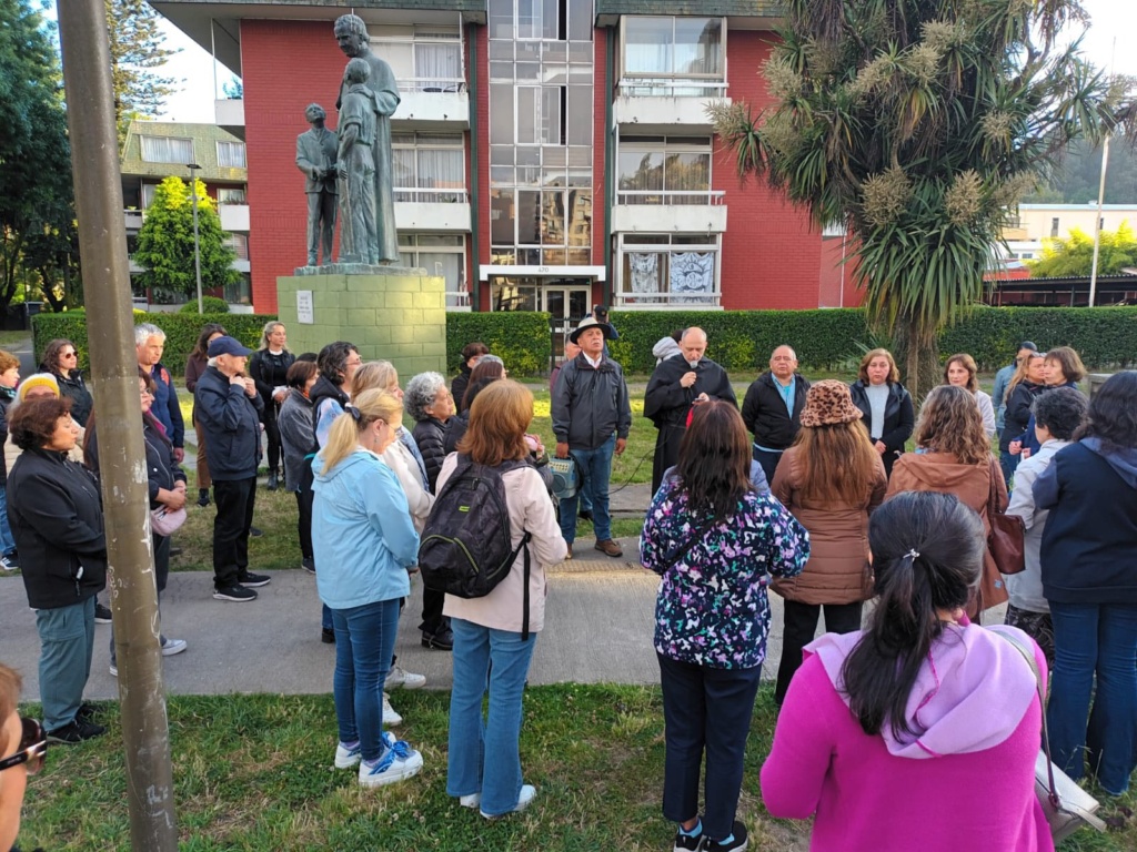Los fieles se congregaron a las 07:15 de la mañana en la Plaza Don Bosco, donde realizaron la oración de envío dirigida por el párroco, padre Samuel Jara, O.S.A. Desde allí, comenzaron a caminar rezando el Santo Rosario hasta llegar a la explanada junto a la Virgen María.