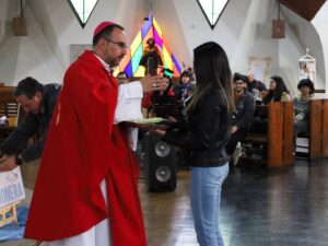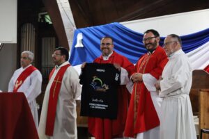 Al término de la Eucaristía, le regalaron la polera oficial de la peregrinación a monseñor Bernardo Álvarez y luego la delegada episcopal de la Pastoral de Juventud le entregó a representantes de la Pastoral de Educación Superior la imagen de San Sebastián, que peregrinará por los diversos estamentos que componen la VPJ durante el tiempo previo al encuentro de noviembre.