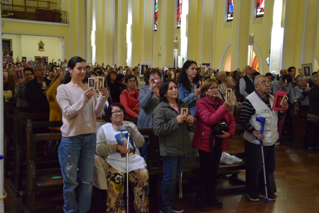 Al término de la Eucaristía, se realizó la bendición solemne de las imágenes de Jesús de la Divina Misericordia. Recordemos que Santa Faustina Kowalska relata en su diario que el Señor se le apareció vestido con una túnica blanca, tenía una mano levantada para bendecir y con la otra tocaba la túnica sobre el pecho, desde donde salían dos grandes rayos: uno rojo y otro pálido. Tras ordenarle que pintara una imagen con la inscripción “Jesús, en Ti confío”, el Señor prometió que “el alma que venere esta imagen no perecerá. También prometo, ya aquí en la tierra, la victoria sobre los enemigos y, sobre todo, a la hora de la muerte. Yo Mismo la defenderé como Mi gloria”.