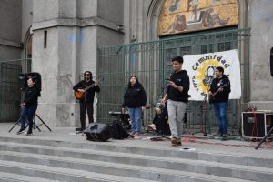 Previo a la Santa Misa, se vivió un momento de alabanza, cantos y dinámicas en el frontis de la Catedral de Concepción, animado por la comunidad Guerreros de la Fe.