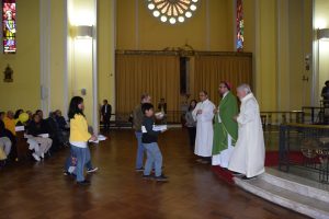 En el momento de la presentación de las ofrendas una familia de la Parroquia La Ascensión del Señor llevó el Altar Familiar, luego voluntarias del Centro de Espiritualidad San Luis Gonzaga entregaron una cuna y un ajuar de bebé, y una familia de la Parroquia Santa Cecilia presentó los dones de pan y vino.