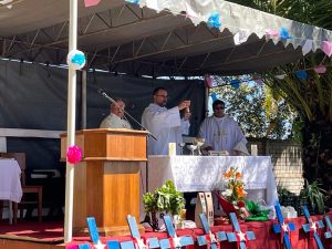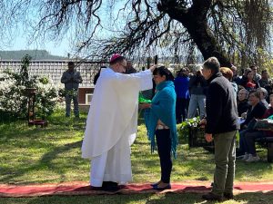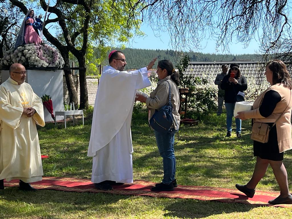 La Santa Misa, que se celebró en el campo de oración contiguo al templo parroquial, fue presidida por el Obispo Auxiliar de Concepción, Monseñor Bernardo Álvarez, junto al Padre Claudio Alarcón, quien predicó la novena los días previos a la fiesta patronal.