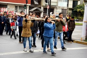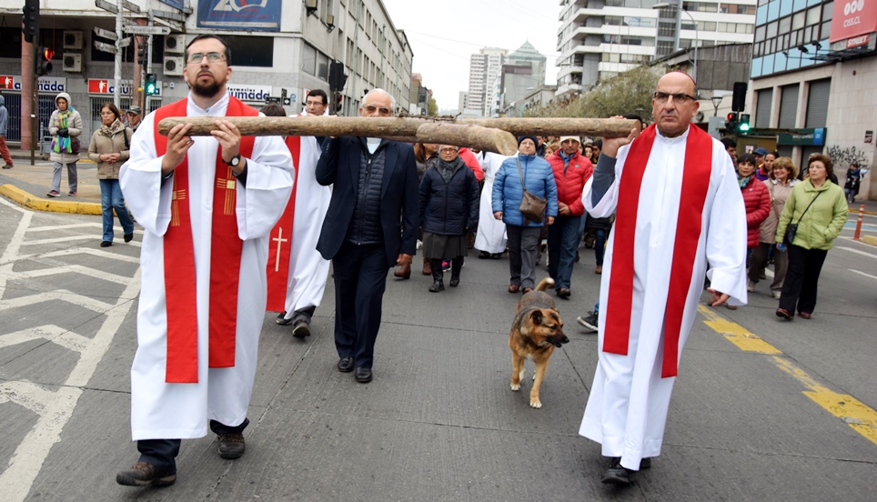 Durante el trayecto, diversos grupos de cinco personas fueron tomando la cruz de madera, hasta alcanzar plaza Independencia, en la decimotercera estación, donde la cruz fue tomada por monseñor Fernando Chomali junto a otros sacerdotes.