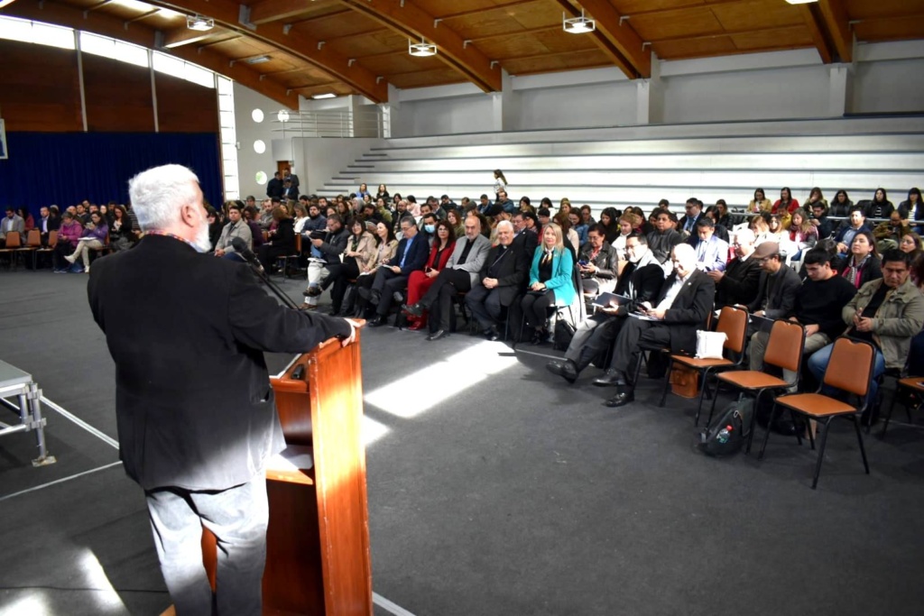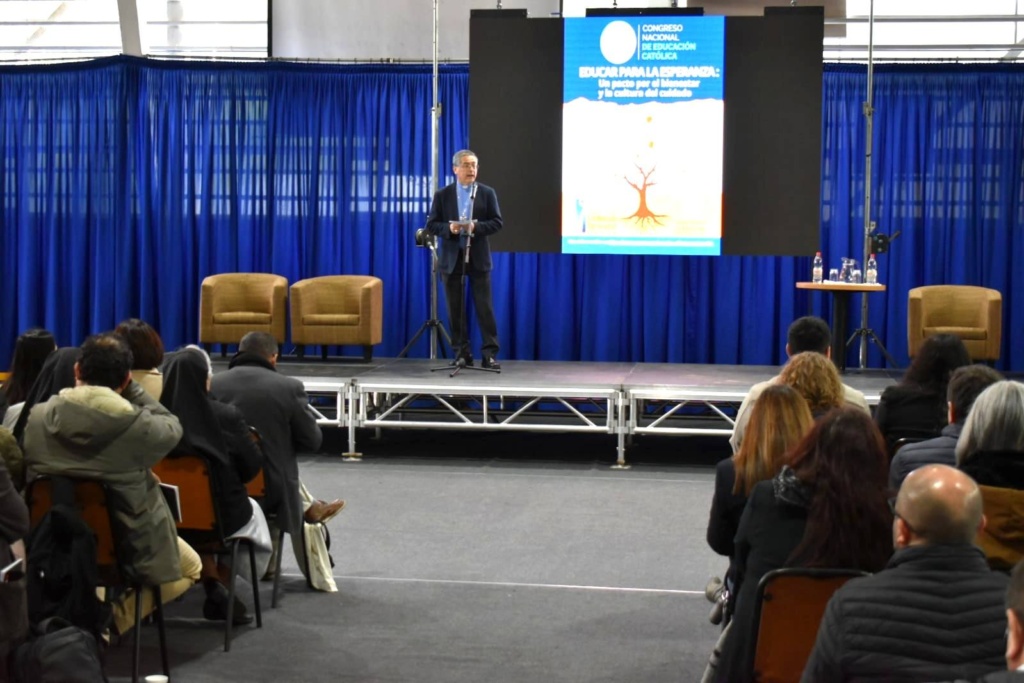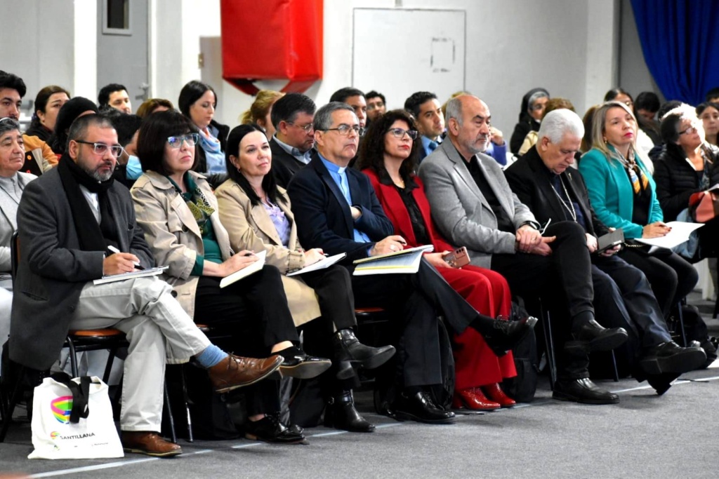 El saludo de bienvenida estuvo a cargo de Monseñor Sergio Pérez de Arce, Arzobispo de Concepción quien destacó la profunda relación que existe entre educación y esperanza. “No se educa fecundamente si no se hace animados por la esperanza y para sembrar en las personas y en el mundo esa misma esperanza”. Luego, saludó también Monseñor Alberto Lorenzelli, presidente del Área de Educación de la CECH, quien dijo “cuidar no es solo proteger, es acoger, escuchar, acompañar y sostener. Es generar entornos donde cada persona, estudiantes, docentes, padres y apoderados, asistentes de la educación, se sienta valorada y respetada. Una cultura del cuidado implica también hacernos responsables unos de otros y reconocer que el bienestar no es solo individual, sino profundamente comunitario”.