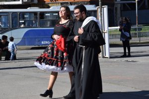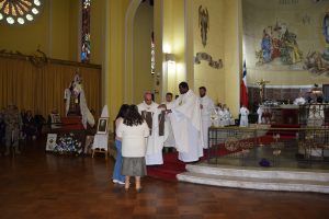 En el momento del ofertorio, fueron presentadas ante el Altar herramientas de trabajo, trigo, uva, el Escapulario de la Virgen del Carmen y la bandera chilena.