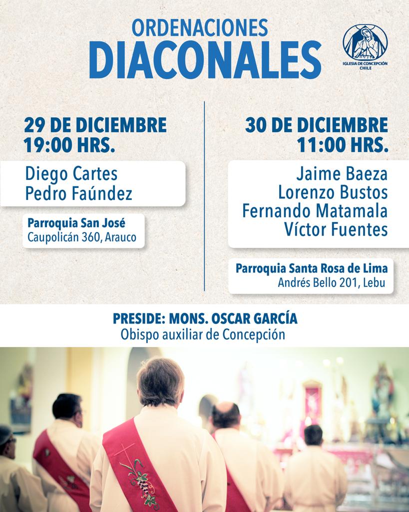 Mientras que el viernes 29 de diciembre, a las 19:00 horas, el Obispo Auxiliar de Concepción, Monseñor Oscar García, ordenará a dos nuevos diáconos en la Parroquia San José de Arauco. Se trata de Diego Cartes y Pedro Faúndez.