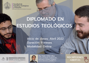 El Diplomado en Estudios Teológicos Online invita a toda persona interesada en la Teología, especialmente catequistas, responsables de pastoral, religiosas, religiosos, profesores de religión y público en general a participar de este programa que se desarrollara en modalidad Online, las clases se desarrollarán mediante video conferencias en plataforma Zoom, utilizando el Entorno Virtual de Aprendizaje de la Universidad Católica de la Santísima Concepción.