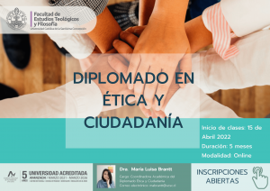 El Diplomado en Ética y Ciudadanía busca desarrollar habilidades y conocimientos en torno a una experiencia ética de la ciudadanía, fundamentada en la dignidad de la persona humana, tanto en profesionales de la educación como en titulados y graduados de distintas disciplinas, con el objetivo de que puedan aportar, desde sus diversas circunstancias vitales y laborales, al crecimiento de la democracia, de la participación y la educación cívica, entendidos como pilares de los derechos humanos.