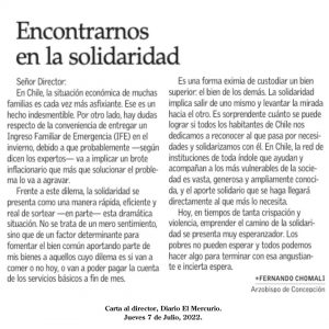 El Arzobispo de Concepción, Monseñor Fernando Chomali Garib, escribió una carta titulada “Encontrarnos en la solidaridad”, que fue publicada la mañana de este jueves 7 de julio en Diario El Mercurio.