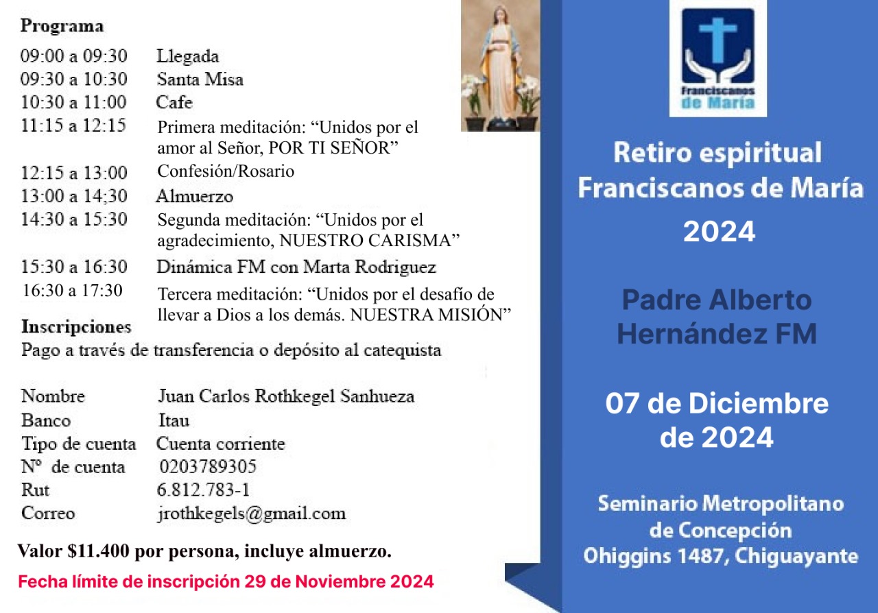 Los Franciscanos de María invitan a la comunidad a participar en un retiro el sábado 7 de diciembre en el Centro de Espiritualidad San Luis Gonzaga de Chiguayante.