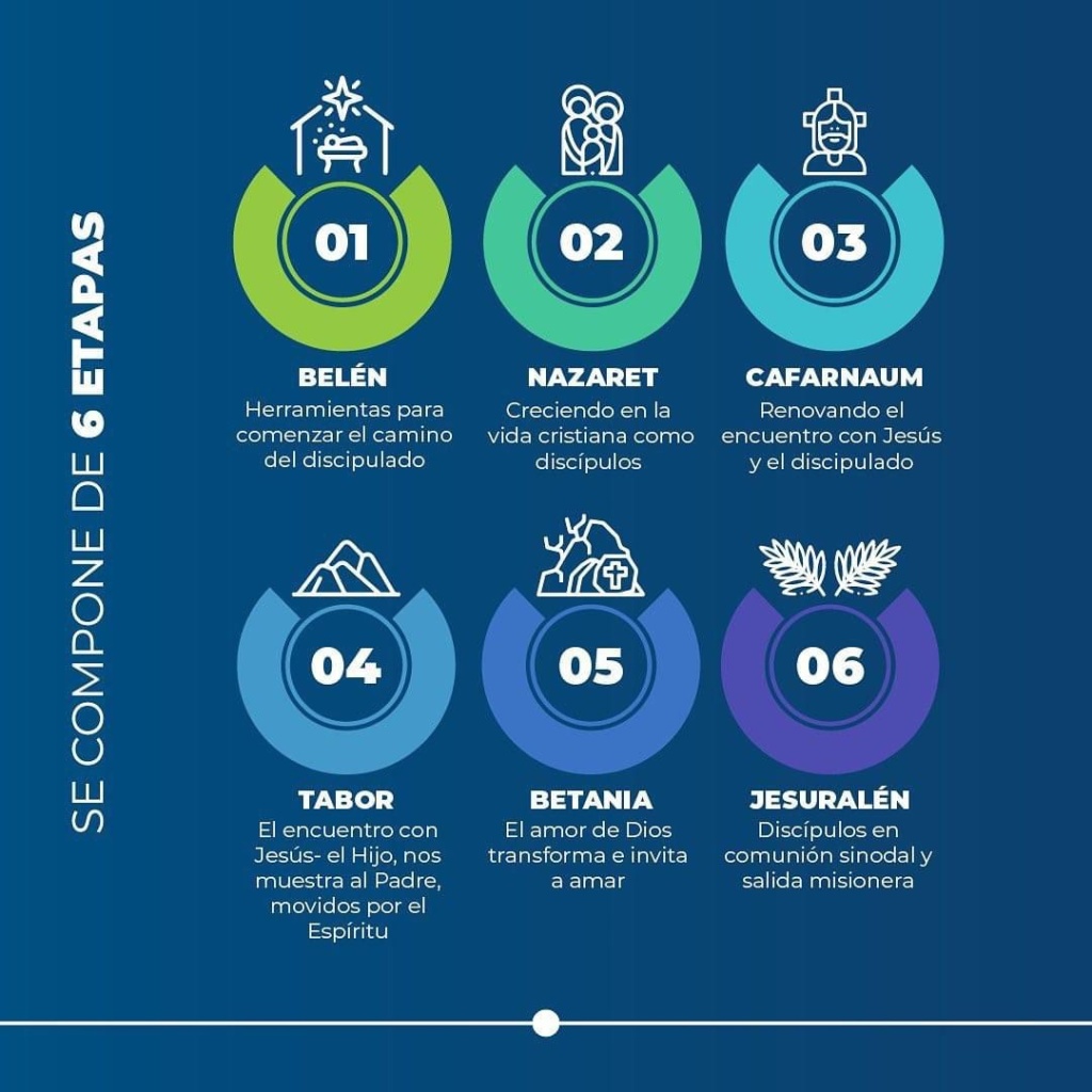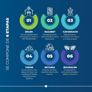 El programa cuenta con seis etapas: Belén, Nazaret, Cafarnaúm, Tabor, Betania y Jerusalén. Cada una de ellas se desarrolla en tres clases mediante la plataforma Zoom y, además, se realizarán dos encuentros comunitarios presenciales durante el proceso: uno intermedio y otro al final del programa. La etapa inicial, Belén, comienza el martes 13 de mayo a las 19:00 horas a cargo del académico Pablo Uribe.