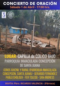 El Concierto de Oración se efectuará en la Capilla San Francisco de Asís de Colico Bajo, que se quemó producto de los incendios que afectaron a la zona.