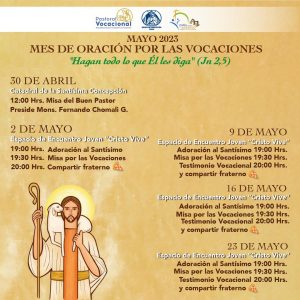 Es así que la Pastoral Vocacional junto a la Vicaría Pastoral de Juventud de la Arquidiócesis de Concepción han dispuesto que los fieles tengan la oportunidad de participar todos los martes en la Adoración al Santísimo Sacramento a las 19:00 horas. Luego a las 19:30 horas se celebrará la Misa por las Vocaciones y posteriormente, a las 20:00 horas, se realizará un compartir fraterno.