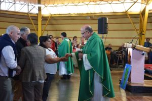 En el momento de la presentación de ofrendas, fue llevado hasta el Altar un cirio encendido, “como símbolo de la fe compartida en estos 12 años de Monseñor Chomali entre nosotros”. Luego, fue presentado ante el Altar un mapa del territorio que abarca la Vicaría de Arauco. Y posteriormente, una canasta familiar “que irá en beneficio de los patroncitos del comedor de esta parroquia, como compromiso al servicio del más necesitado”.