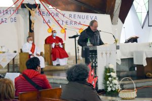 Tras el Rito de la Comunión, el Delegado de la Renovación Carismática en la Arquidiócesis de Concepción, Juan Pomeri, agradeció a Monseñor Bernardo Álvarez y al Diácono Pedro Pablo Torres por acompañarlos en esta Eucaristía e invitó a la comunidad a levantar sus manos para pedir una efusión del Espíritu Santo para ambos.