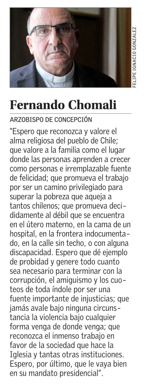 El Arzobispo de Concepción, Monseñor Fernando Chomali Garib, afirmó que espera que el nuevo Presidente de nuestro país “reconozca y valore el alma religiosa del pueblo de Chile”.