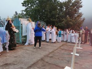 Además, en la procesión hubo personas que representaron a algunas advocaciones marianas, como la Virgen de Guadalupe, Virgen del Carmen y la Virgen de los Rayos, entre otras.