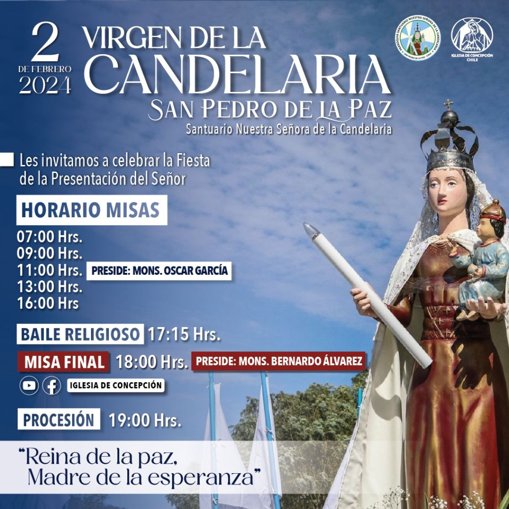 La Misa de clausura de la festividad de la Virgen de la Candelaria será a las 18:00 horas y será presidida por el Administrador Diocesano de la Iglesia de Concepción, Monseñor Bernardo Álvarez, tras lo cual se efectuará una procesión hasta la Laguna Chica de San Pedro de la Paz, a las 19:00 horas.