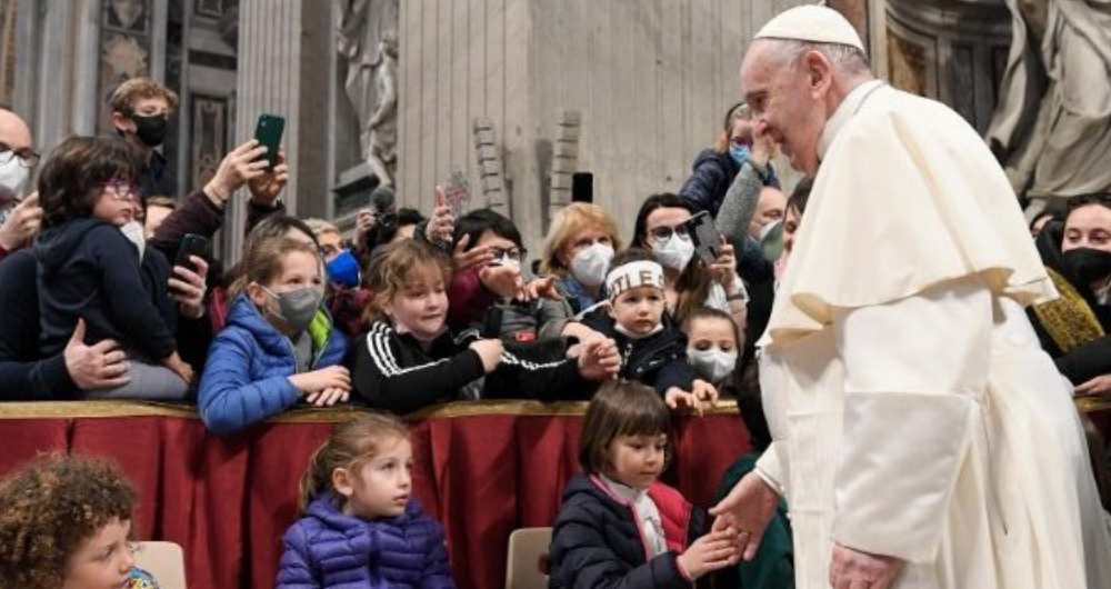 “Y ahora les pido que piensen, que tengan un pensamiento. Miremos todos a nuestro corazón y pensemos en los muchos niños, niñas, chicos y chicas que están en guerra, que hoy están sufriendo en Ucrania, ellos son como nosotros, como ustedes. Seis, siete, diez, catorce años y ustedes tienen un futuro por delante, la seguridad social de crecer en una sociedad en paz. En cambio, estos pequeños, incluso pequeñísimos, tienen que huir de las bombas, están sufriendo, muchos, con ese frío que hace allí… Pensemos. Que cada uno de nosotros piense en estos niños, niña y en estos chicos y chicas, que están sufriendo hoy, a 3000 km de aquí. Recemos al Señor. Yo haré la oración y ustedes con su corazón con su mente recen conmigo. Señor Jesús, te pido por los niños y las niñas, los chicos y chicas que están viviendo bajo las bombas, que ven esta terrible guerra, que no tienen nada que comer, que tienen que huir, dejándolo todo en casa… Señor Jesús, mira a estos niños, a estos niños, protégelos, son las víctimas de la soberbia de nosotros, los adultos. Señor Jesús, bendice a estos niños y protégelos. Juntos rezamos a la Virgen para que los proteja. Y así, en silencio, de pie, recibimos la bendición del Señor”.