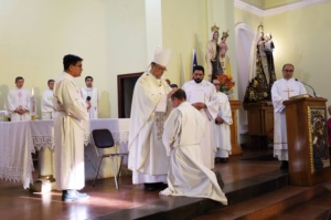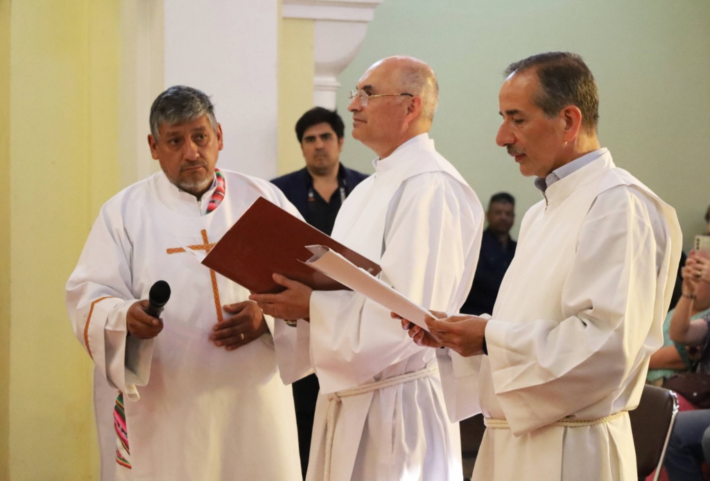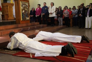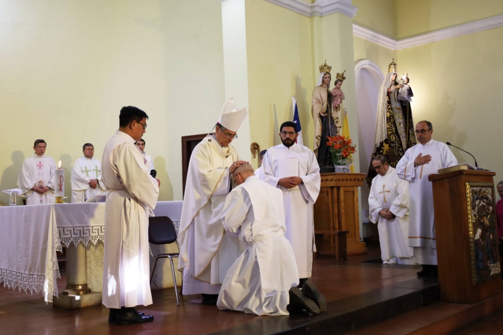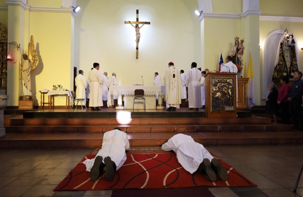 Posteriormente, los dos se postraron como símbolo de su disponibilidad a la acción del Espíritu Santo y la asamblea entonó las Letanías de los Santos. Después, monseñor Sergio Pérez de Arce SS.CC. les impuso las manos, gesto que junto a la oración consagratoria, los incorporó al Orden de los Diáconos.
