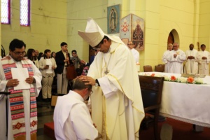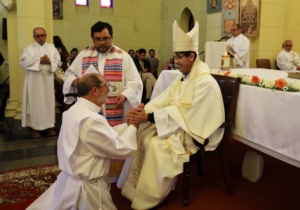 Posteriormente, se postró como símbolo de su disponibilidad a la acción del Espíritu Santo y la asamblea entonó las Letanías de los Santos. Después, monseñor Oscar García le impuso las manos, gesto que junto a la oración consagratoria, lo incorporó al Orden de los Diáconos.