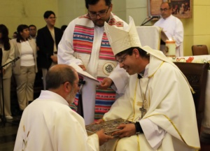 Tras la Plegaria de Ordenación, el padre Jorge Araya revistió al nuevo diácono con los ornamentos propios de su ministerio: la estola diaconal y la dalmática. Luego, el obispo le entregó el Libro de los Evangelios, como signo de su misión. “Recibe el Evangelio de Cristo, del cual has sido constituido mensajero. Esmérate en creer lo que lees, enseñar lo que crees y vivir lo que enseñas”, le dijo.