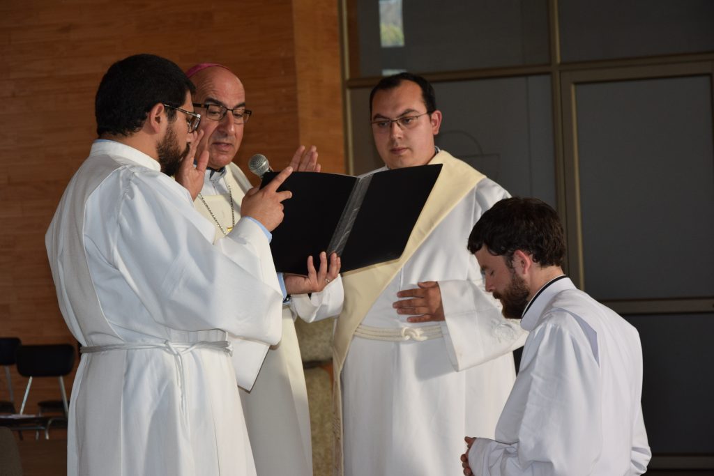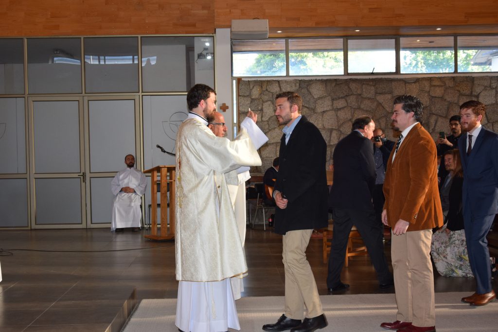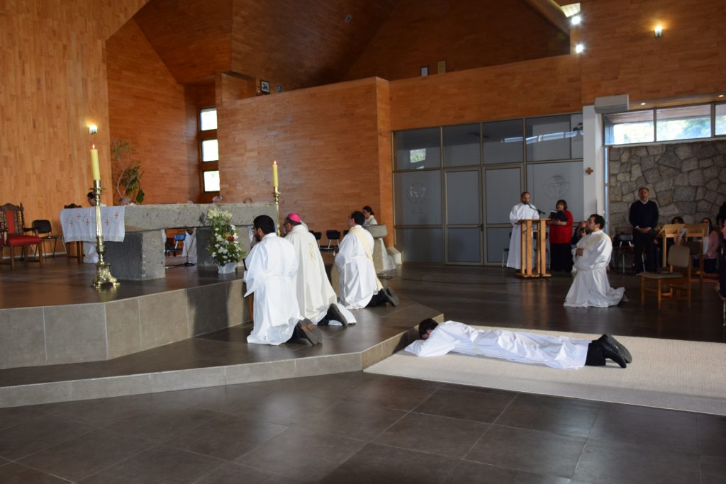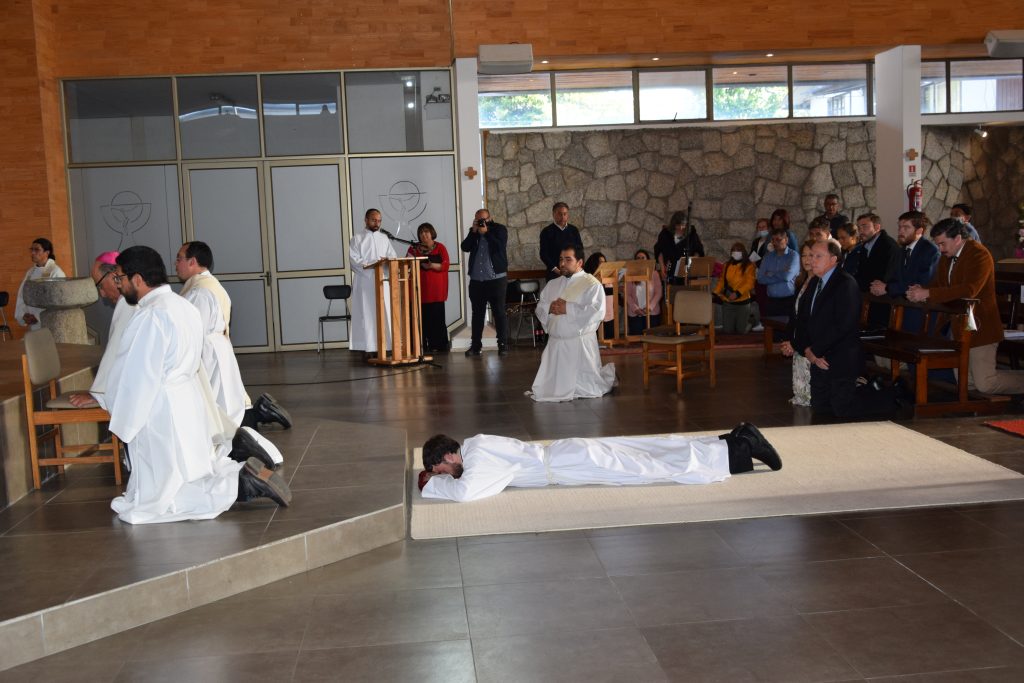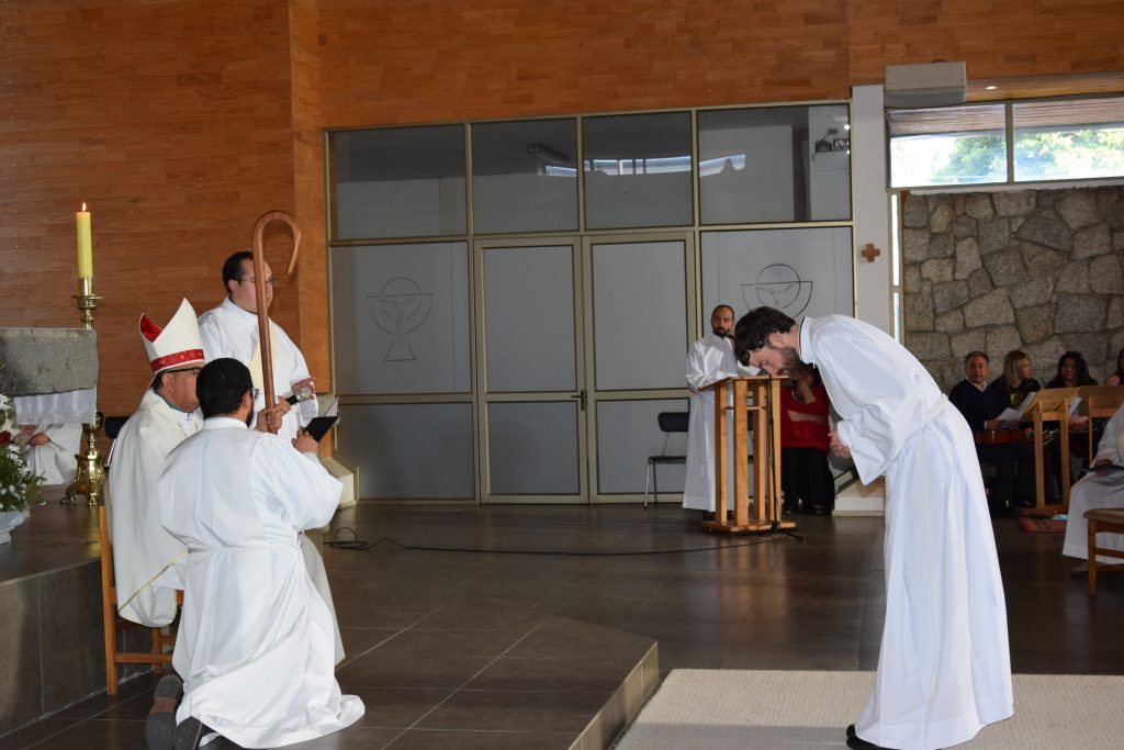 Posteriormente, el seminarista se postró y la asamblea entonó las Letanías de los Santos. Después, el Arzobispo de Concepción le impuso las manos, gesto que junto a la oración consagratoria, incorporó a Santiago Hameau al Orden de los Diáconos.