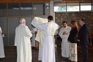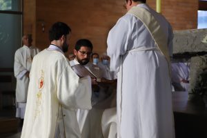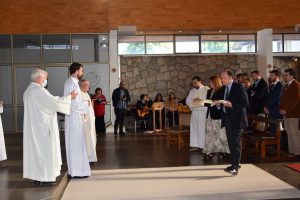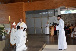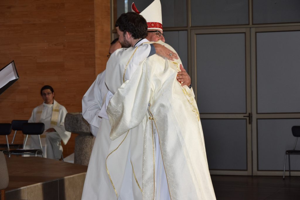 Tras la Plegaria de Ordenación, el nuevo Diácono fue revestido con los ornamentos propios de su ministerio: la estola terciada y la dalmática, que fueron presentadas por sus padres. Y luego, Monseñor Fernando Chomali le entregó el Libro de los Evangelios, como signo de su misión: “Recibe el Evangelio de Cristo, del cual has sido constituido mensajero; convierte en fe viva lo que lees, y lo que has hecho fe viva enséñalo, y cumple aquello que has enseñado”.