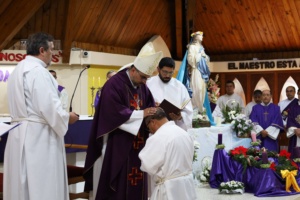 Posteriormente, se postró como símbolo de su disponibilidad a la acción del Espíritu Santo y la asamblea entonó las Letanías de los Santos. Después, monseñor Bernardo Álvarez le impuso las manos, gesto que junto a la oración consagratoria, lo incorporó al Orden de los Diáconos.