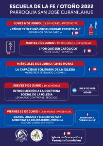 La Parroquia San José de Curanilahue invita a participar en la Escuela de la Fe Otoño 2022, que se realizará entre el lunes 6 y el viernes 10 de junio, a las 19:10 horas.