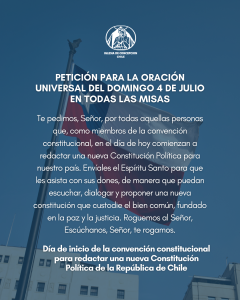 En el marco de lo que será el inicio del trabajo de quienes redactarán una nueva Constitución para la República de Chile este próximo domingo 4 de julio, el Comité Permanente de la Conferencia Episcopal de Chile (CECh), aprobó la iniciativa propuesta por la Comisión Nacional de Justicia y Paz, a partir de la solicitud expresa de algunos constituyentes, y busca la unidad de la Iglesia a través de la oración.