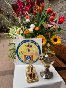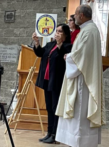 Fue así que miembros de la Catequesis Inclusiva presentaron una ofrenda de flores a la Virgen, una de las catequistas presentó el nuevo logo de las catequesis y una familia llevó las especies de pan y vino.