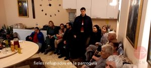 “El primer pánico ha terminado por ahora. Muchas personas vinieron a la parroquia en busca de ayuda y refugio, por lo que hemos establecido un alojamiento de emergencia en el sótano de nuestro monasterio y en la iglesia del monasterio sin terminar. En este momento tenemos alrededor de 80 personas con nosotros, incluidos miembros de la parroquia y personas de los edificios circundantes”, dijo el Padre Román.