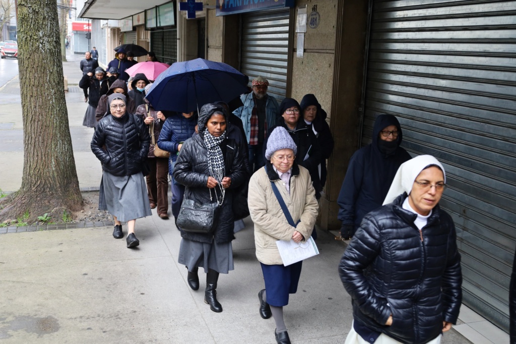 La lluvia no fue impedimento para que los religiosos y religiosas caminaran rezando el Santo Rosario, recorriendo varias calles del centro penquista. Ya en la catedral, hubo confesiones y se celebró la Eucaristía junto a la comunidad. Presidió el Arzobispo de Concepción, Monseñor Sergio Pérez de Arce SS.CC.